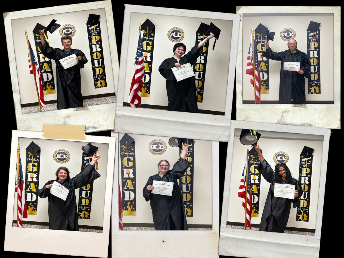 Congratulations to Mason Mitchell, Jacy Pugh, Brandon Warrick, Amber Herrera, Paiton Stewart, Marie Bastien, and William Overstreet (not pictured). These seven individuals earned their High School Equivalency diplomas and are part of Warren Adult and Continuing Education's Class of 2024. By offering both the GED and the HiSET exams, students have multiple pathways to earn this credential. "Go confidently in the direction of your dreams. Live the life you have imagined." ~ Henry David Thoreau