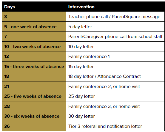 If a student has continued absences during the school year, the school will reach out through phone calls and letters to identify if there are family or student needs we can support. We have adjusted the frequency of these communications for the second semester. There may be some overlap between our old and new steps. We appreciate your understanding as we make these adjustments for improvement in the second semester. Below are the steps and the school’s actions.
